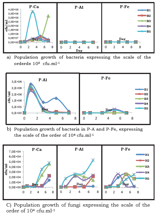 Both fungi and bacteria, showed the highest growth population (Figures 4a and c) when the source used was P-Ca, coincident with the production of acids (Figure 3). Papagianni (2004), argues that one of the determining factors in the generation of secondary metabolites (in this case, organic acids) is the development of microorganisms. In the P-Ca medium, fungi remained in exponential phase, while bacteria achieved twice the population obtained by fungi between days 3 and 5. However, 4 of the 5 bacteria showed a population decrease in day 7, except the B3 which took almost 5 days to begin growth and reached only the exponential phase (Figure 4a and c). On the contrary, fungi with smaller populations remain longer, which is a sustained ability to produce acids that are more organic and therefore, solubilize more phosphorus.