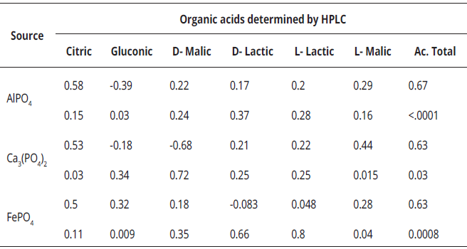 In contrast, Ghaly & Kamal (2004), and Rathi et al. (2002), who in biological systems and fermentation processes found CV between 3.9% and 39.05%. Low and/or negative Peason correlations are also evidence, no significantly response among the estimated acids and soluble phosphorus (Table 2).
