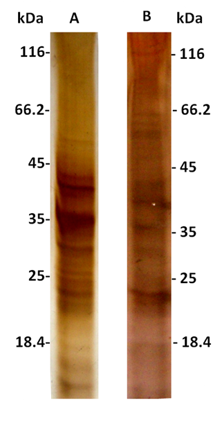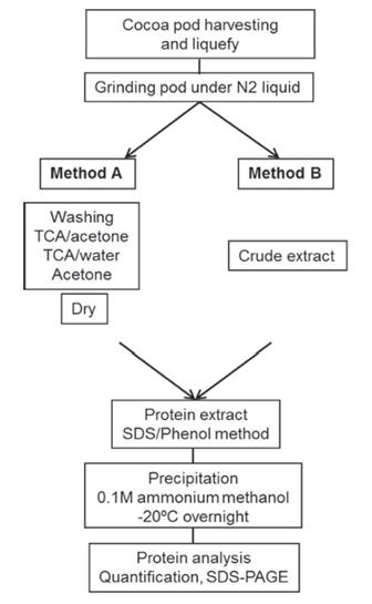 In order to obtain quality proteins and successfully apply proteomic analyses, it is necessary to develop an efficient protocol for protein extraction specifically from pods of this species. Thus, we tested and compared two protein extraction methods reported in literature to have been successful with other recalcitrant tissue types. Concretely, we evaluated two methods (A and B) for the preparation of tissue for total protein extraction using phenol/SDS extraction protocol.