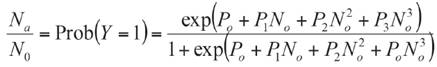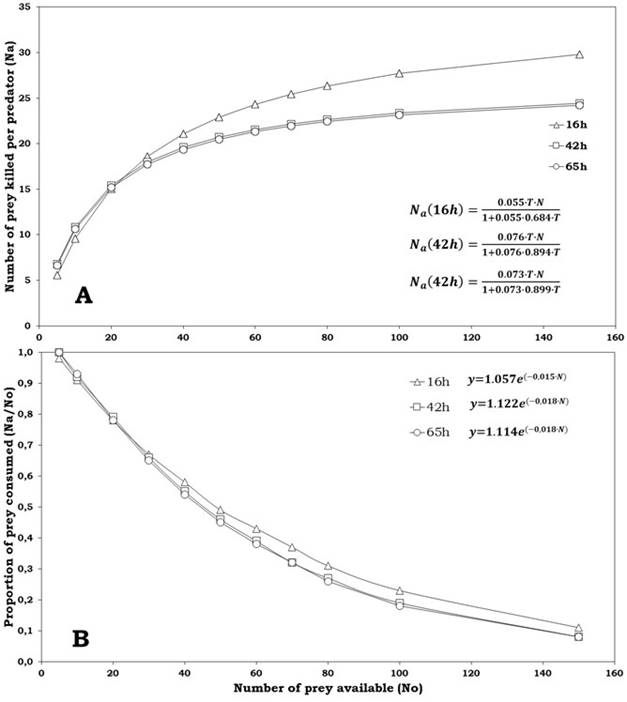 Where Y, is the dichotomous dependent variable, representing a non-consumed (Y=0) or consumed (Y=1) prey at the end of the trial, Na is the number of prey consumed, No is the number of prey available; and P0, P1, P2 and P3 are the intercept, linear, quadratic and cubic coefficient, respectively. Negative or positive significant linear coefficients (e.g., P1 ) indicate a type II or III functional response, respectively. The slope of type II response decreases (e.g., P1 is negative), while that slope of type III increases (e.g., P1 is positive). After determining the type of functional response, its parameters (attack rate and handling time) are estimated through linearization of Holling' s disc equation depending on the type of functional response (Xiao & Fadamiro, 2010). Type II equation was used: a and Th parameters were calculated using a nonlinear regression by least squares based on Gauss-Newton method (SAS Institute, Cary, NC, USA). The a/Th value indicates the effectiveness of depredation. The maximum depredation rate (K) was calculated as T/Th . To perform comparisons between a and Th parameters, standard deviation was estimated with 95% confidence interval using Jackknife statistical technique available in SAS (SAS Institute, Cary, NC, USA). Later, the parameters were compared using non-parametric Kruskal-Wallis test (α=0.05) due to heterogeneity of variances and non-normally distributed residuals.