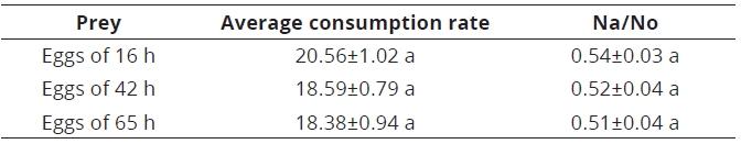 The average consumption rate of C. picanus did not show significant differences among the three types of eggs offered [KW=4.04;gl=2; P=0.131]. This indicates that the maturity time of eggs offered as prey have no influence in the preference by C. picanus. The predator consumed 54, 52 and 51% of initial egg density at 16, 42 and 65 h, respectively, not showing significant differences [KW =1.166; gl=2; P=0.556] (Table 1).