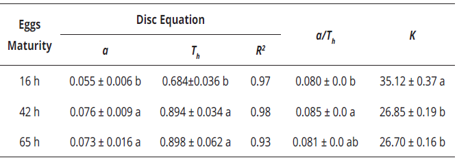 The search (or attack) rate and the handling time are parameters used to determine the magnitude of the functional responses. This parameter could be affected by different factors, such as the predator velocity, the prey movements and the spent time in subduing each prey (Hassell, 1978). In this research, the handling time for eggs of 16 h was significantly lower than for eggs of 42 and 65 h, which could be explained for the presence of a higher amount of vitellus and the easiness to extract it. When eggs mature, the embryonic development makes diminish the amount of vitellus, making difficult its extraction and making to take longer time to predator in feeding. Cabrera, Donohuea, Khalil, Sonenshinec & Roea (2009), pointed that there is no available studies describing the characteristics of proteins in the yolk of mite eggs. According to these authors, in newly oviposited tetranychids eggs (<3 h), the embryo development would be minimal and the proteins would be more available for predators. Therefore, we can deduce that as time progress and egg maturity with it; the eggs of 42 and 65 h present higher embryo development, so the amount of vitellus must be minimal and thus of lower nutritional value.