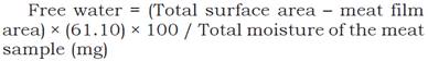 Water retention capacity (WRC) in the sausage, was determined according to what was reported by Dzudie et al. (2002). A sample of approximately 0.5 g was deposited on a grade 1 filter paper and pressed among two plexiglass plates for 20 min under 1 kg of weight. The area of the pressed flesh and juice propagation, were determined by the software Imagej, (Imagen j(r) 1.40 g, Wayne Rasband, National Institutes of Health, USA). WRC, was calculated according to the established in Equations 1 and 2.