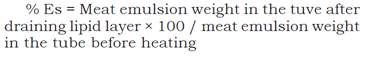 Emulsifying stability (Es), was determined in the meat emulsion. For this purpose, approximately 30 g of mass, was extracted from the cutter and deposited in Petri dishes for further analysis. In pre-weighed 15 ml falcon tubes, 8 g of meat emulsion was deposited and placed in a plastic grid. The tubes were heated for 30 min in a water bath at an average temperature of 75 ± 1° C (Choe et al., 2013). Subsequently, the tubes were centrifuged at 895 g for 5 min at 25° C, and the lipid layer detached from the mass (Yasumatsu, Sawada, & Moritaka, 1972). Es, was calculated by Equation 3.