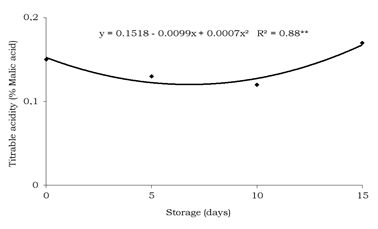 The titratable acidity was decreased until the eighth day of storage, but at the end of storage it was increased (Figure 3), probably due to the occurrence of fermentation, with the onset of senescence (Miranda et al., 2003).