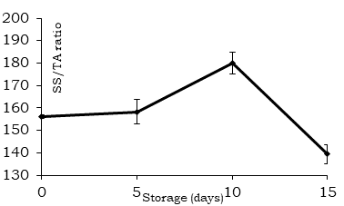 There was an increase in the SS/TA from the fifth day of storage reaching a maximum on the tenth day, followed by a sharp reduction up to the end of the storage (Figure 7) due to the observed increase in titratable acidity coinciding with the start of senescence. This relationship is one of the best ways to evaluate the flavor, more representative than the isolated measuring of sugar or acidity, providing a good idea of the balance between these two components (Chitarra & Chitarra, 2005).