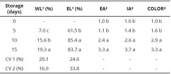 The loss of fruit weight reached about 20% after 15 days of storage, which compromised the fruit appearance which became wrinkled (Table 1).