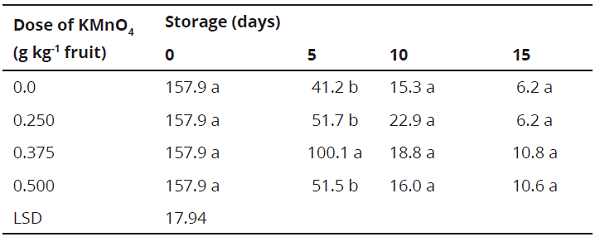 Although, for fruits treated with potassium permanganate, the firmness reduction was delayed, with an observed more efficient result for the dose of 0.375 g until the fifth day of storage (Table 2).