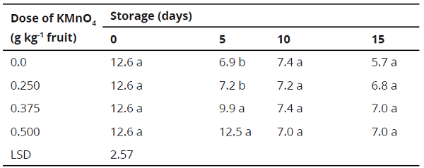 In all treatments, vitamin C decreased over time of storage (Figure 2), the doses of 0.375 and 0.500 g of potassium permanganate providing larger retardation in vitamin C reduction during storage, and more effective to fifth day of evaluation (Table 3).