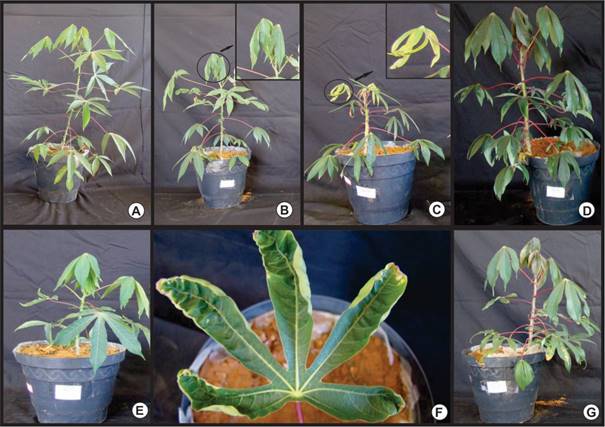 Chlorosis in older leaves and wilting in young leaves were observed in the plots in which was applied the mixture fluazifop + fomesafen (Figure 1-G), while plants treated with fluazifop did not show apparent visual symptoms (Figure 1-D). Indicating that in the mixture of fluazifop and fomesafem, there are not synergistic effects and the damage to cassava leaves are the caudate fomesafem.