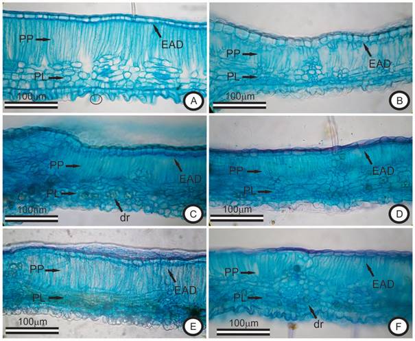 Evaluations were made of the following characteristics: leaf blade thickness (LB), thickness of the palisade parenchyma (EAD), spongy parenchyma (PL), thickness of the adaxial epidermis (EAD) and thickness of the adaxial wall (PD). Other variables were also calculated from area measurements: proportion of adaxial epidermis (% EAD), proportion of palisade parenchyma (% PP), proportion of spongy parenchyma (% PL) and proportion of abaxial epidermis (% EAB), as well as the visual integrity of the tissues.