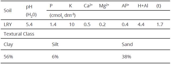 The experiment was conducted in a green house, with controlled conditions of temperature and humidity. It was used a Red Yellow Latosol soil with clay texture. Soil physical and chemical analysis showed in Table 1, according to EMBRAPA soil classification.