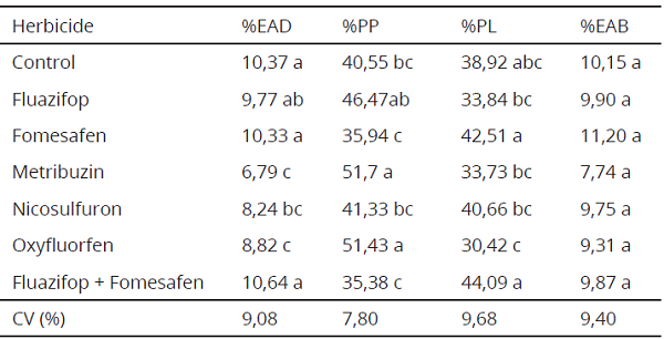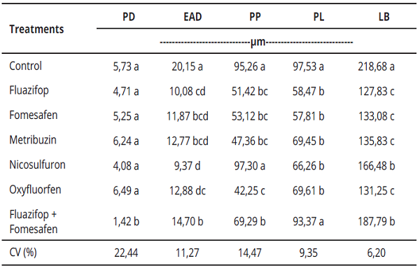 When assessing the proportion of spongy parenchyma (%PL), it was found that the fomesafen, nicosulfuron and fluazifop + fomesafen herbicides, promoted increases of about 9, 4 and 13%, respectively, in the %PL. The other herbicides, led to a decrease in the values of this variable compared to the control, corresponding to 15, 15 and 22% for fluazifop, metribuzin and oxyfluorfen herbicides, respectively (Table 2).