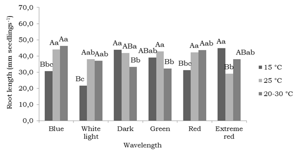It was verified higher root length at 25 and 20-30ºC associated to blue, red and white light wavelengths, indicating the inhibition band of 440 nm, was attenuated by higher temperatures (Figure 3).