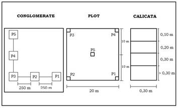 A double-stratified sampling design was applied, consisting of two phases. During the first phase, a relatively large sample was systematically selected throughout the location. This sample was used to estimate the size or weight of the strata in relation to the population and sample. In the second phase, a smaller sample corresponding to the evergreen Andean forest of the Andean fringe, in which a conglomerate was selected (C) of 5 plots (P) in the shape of an "L" was established, with a dimension of 20 x 20 m. A distance among plots of 250 m (Figure 2).
