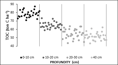 The determination methodology for TOC by LOI, showed the greatest reserve of TOC, which is found in C1 P5 with 271.77 Mg C ha-1 and lowest concentration in C3 P5 with 239.52 Mg C ha-1. For DUMAS method, the largest stored C stock is found in C1 P5 with 268.45 Mg C ha-1 and the lowest, in C3 P5 with 234.34 Mg C ha-1.