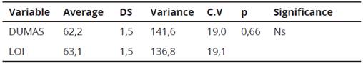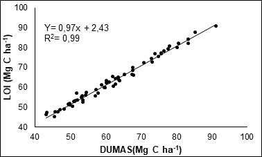 The slope of the relationship among TOC determined by the LOI methodology and TOC determined by DUMAS method, did not differ (p> 0.5), indicating both methodologies do not support the quantification of TOC, which was reflected in the low variation coefficient among methods being less than 19%, presenting statistical differences, which not were significant among methods. However, variation coefficient for DUMAS method, was lower than obtained by LOI (Table 3).