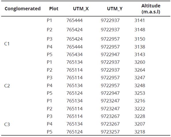 The plots were georeferenced and distributed in sites accessible to the collection of soil samples (Table 1), in an altitudinal range that goes from 3140 to 3265 m.a.s.l., where we find a high biodiversity (Silva & Tonello, 2014), With a sandy loam type, granular structure, stoniness less than 5%, black coloration and large amount of organic matter (Cargua, Rodríguez, Recalde & Vinueza, 2014).
