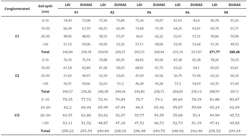 Applying the LOI methodology, carbon content (C) was determined in the soil, with a mean of 64.4 Mg C ha-1 in the cluster one, in the cluster two 63.3 Mg C ha-1 and for cluster three 61.7 Mg C ha-1, the largest TOC reserve is at C1 P5 with 271.77 Mg C ha-1, and the lowest in C3 P5 with 239.5 2 Mg C ha-1 (Table 2). The statistical analysis shows highly significant differences among depths and non-significant among plots, with a variation coefficient of 4.39%.