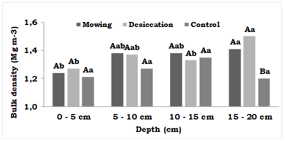 BD presented interaction among factors (Table 1) and was influenced mainly by depth, where we observed an increase in depth for the mowing and desiccation treatments. The control treatment was the only treatment that did not suffer this influence (Figure 1). For the 15-20 cm layer, the control treatment had the lowest BD.