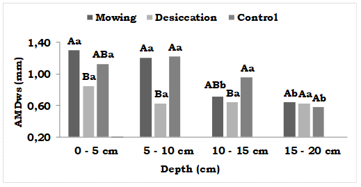 We observed differences in depth only for the mowing and control treatments with lower AMDws values in layers 10-20 cm for mowing and 15-20 cm for control. The desiccation treatment presented the lowest means in the first three layers and did not differ as a function of depth (Figure 2).