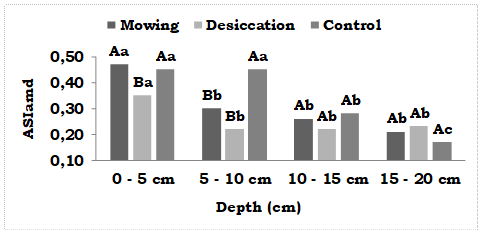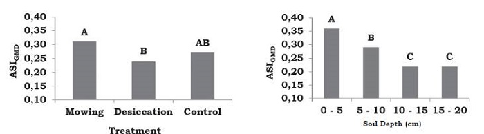 For the aggregate stability index of geometric mean diameter (ASIGMD), which presented significance for each factor alone (Table 1), we observed influence of the treatments, with mowing presenting the highest index and desiccation the lowest. Furthermore, we observed the decrease of the index in depth, with lower values for the 10-15 and 15-20 cm layers (Figure 5).