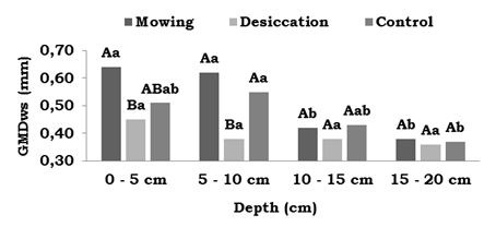 In the first two depths sampled, the lowest GMDws was observed in the desiccation treatment, corroborating with the data presented by Alcântara and Ferreira (2000), who, however, observed the highest means for the control area, not for mowing.