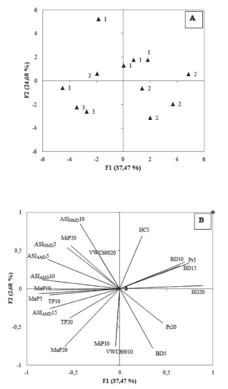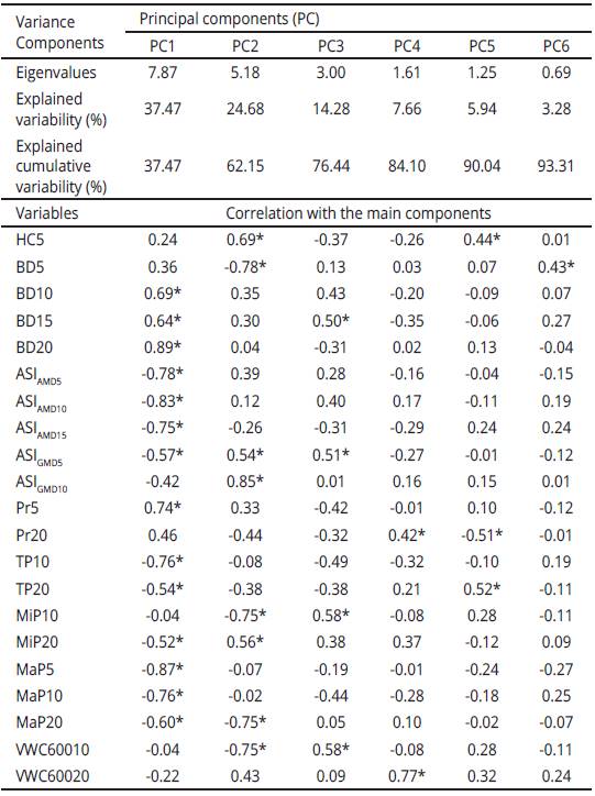 For the second principal component (PC2), the following attributes stood out: HC5, ASIGMD5, ASIGMD10 and MiP20 showed positive and highly significant scores, and BD5, MiP10, MaP20 and VWC60010, all with negative scores and highly significant. For the other principal components (PC3, PC4, PC5 and PC6) we observed that the proportion of explained variance (%) decreased, just as there are lower scores with highly significant values of the variables and higher scores with values considered slightly to moderately significant (Table 3).