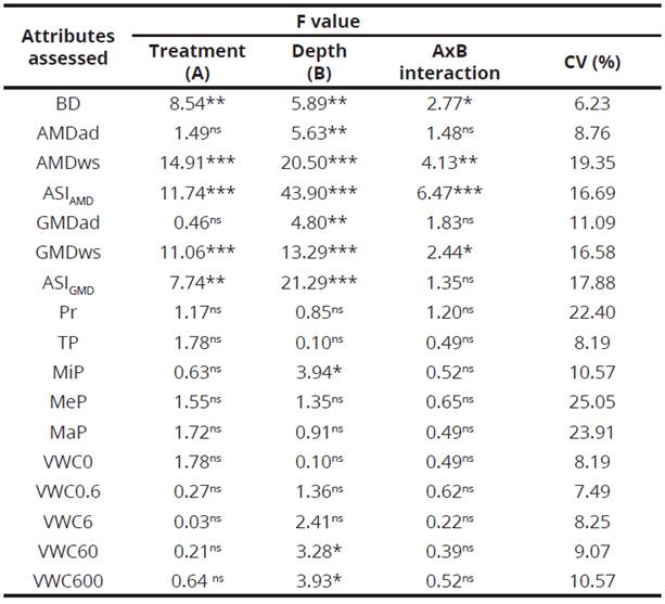 In general, data variability was greater for the treatment factor, which showed significance only for BD, AMDws, ASIAMD, GMDws and ASIGMD. For the interaction between treatment and depth, only BD, AMDws, and ASIAMD GMDws were significant. The depth factor showed a greater number of attributes with significance by F test (Table 1).
