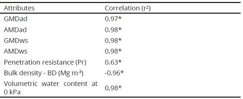 There was a pattern to the values of mean diameter of water-stable aggregates and aggregate stability indices, obtained arithmetically or geometrically, of lower values for the desiccation treatment, especially in comparison to the mowing treatment. Dalla Rosa et al. (2013), and Brandão & Silva (2012), found the influence of the roots of cover crops in the formation and stability of aggregates, uniting smaller aggregates to form larger aggregates.
