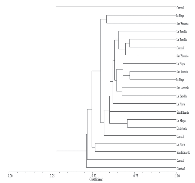 In general, the groupings had a loose distribution of S. quitoense materials, with no relationship with the districts, but showed an exchange or gene flow among them. Furthermore, there were no associations for the presence or absence of thorns, as has been reported in other studies on S. quitoense genetic diversity (Riascos et al., 2012). The obtained results in this research, are different from those obtained by Fory et al. (2010), who reported low variability in cultivated species of S. quitoense, using AFLP markers. This difference is associated with the type of marker as follows: AFLP and RAM markers, are dominant and COS II markers are co-dominant, and are designed based on conserved exon in order to amplify intron sequences, which increases the possibility to find polymorphism.