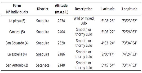 Young leaves were collected from a total of 21 S. quitoense materials in the province of Neira, municipality of Pachavita in the Soaquira district, department of Boyaca, Colombia; located at an altitude of 1985 m. a. s. l. with an average temperature of 16°C and in the Sacaneca district, at an altitude of 2148 m. a. s. l., with an average temperature of 17°C (Table1).