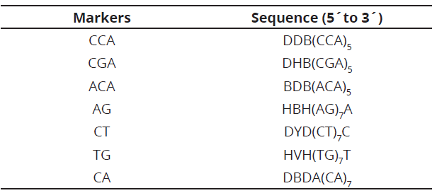 Among the known molecular markers, RAM (Random Amplified Microsatellites) are very useful for measuring genetic diversity in plants and animals to detect differences among families, species and within species. In addition, Muñoz et al. (2008), showed that the variation basis of individuals, have allowed the selection of specific regions within the DNA molecule for determined studies, the number of detectable polymorphisms is theoretically unlimited and allows for the analysis of information that is both expressed and non-expressed. This method is feasible to implement in small laboratories in terms of equipment and facilities cost; it requires no prior sequencing knowledge or the use of radioactive isotopes; therefore, can be used in characterization studies of genetic diversity (Morillo et al., 2014).
