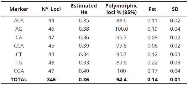 The seven RAM markers used in this study generated 346 alleles, which ranged from 43 for the CT marker to 48 for TG marker, with molecular weights between 300 and 1000 bp (Table 3). The number of bands was suitable for estimating parameters of genetic diversity when compared with the obtained results in other studies on S. quitoense and other Solanaceae species (Saliba-Colombani et al., 2000; Toquica et al., 2003; Fory et al., 2010). TG marker, performed the greatest contribution to the observed variation with a 0.22 Fst, which means it can be useful for other studies on the genetic diversity in the Solanum genus.