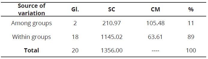 The coefficient of genetic differentiation (Fst = 0.14 ± 0.01), suggests an intermediate level of genetic differentiation, which may be due to the state of domestication of the evaluated materials and may also indicate that there is a moderate relationship between the geographical location and genetic group (Morillo et al., 2014). The molecular variance analysis AMOVA, showed the genetic variation observed in the evaluated S. quitoense materials, was mainly within groups, with 89 % (Table 4). This high variation could indicate the presence of higher levels of subdivision and hierarchy. The remaining 11% was due to the component of genetic variance among groups, which was significant (P≤0.001). Such genetic variation among groups, might be used for conservation and breeding of this species. Similar results have been reported in other studies of genetic diversity in the genus Solanum using microsatellite markers (De Galarreta et al., 2007; Mercati et al., 2015; Zhou et al., 2015).