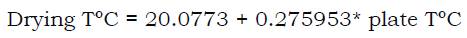 [Equation 1]Given the p-value according to ANOVA is lower than 0.01, there is a statistically significant relationship between Drying T°C and Plate T°C for a confidence level of 99%. The R2 statistic, indicates that the model explains 61.3763% of the variability in Drying T°C. The correlation coefficient is equal to 0.78343, indicating a moderately strong relationship among variables. The standard error of the estimate, shows the standard deviation of residuals being 2.51359.