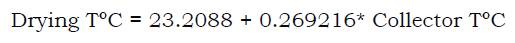 [Equation 2]Given that p-value in the ANOVA is lower than 0.01, there is a statistically significant relationship between Drying T°C and Collector T°C for a confidence level of 99%. The R2 statistic indicates that the model explains 59.672% of the variability in Drying T°C. The correlation coefficient is equal to 0.772477, indicating a moderately strong relationship among variables (Figure 6).