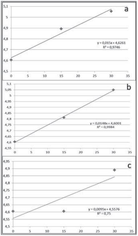 At 15 and 30 days in the process of dehydration of the fruits evaluated, specifically in the replicas obtained, was determined in CFU.g-1 and the maximum allowed values were taken, as the microorganisms multiply exponentially, a mathematical model was used applying logarithms, By clearing the variable x as time, one has the values of useful life. According to the projections made, 106, 109 and 174 days are estimated for mamey, banana and pineapple, respectively (Figure 4).