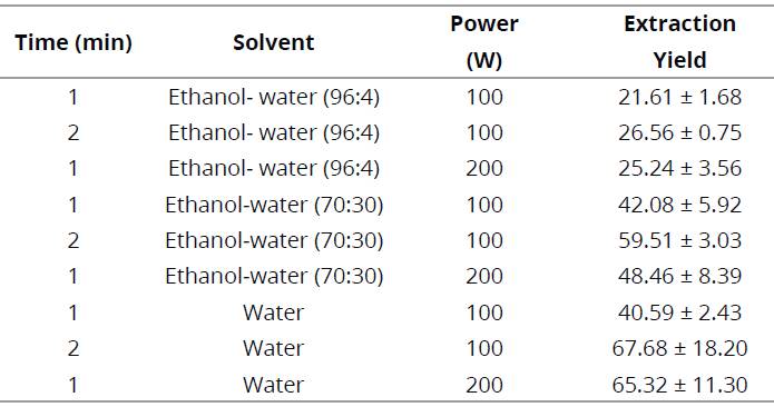 According to the results presented in Table 1, corresponding to the microwave extraction, it was observed that the solvent with higher extraction yields obtained was water, followed by the mix ethanol-water (70:30), which is an advantage considering that extraction costs are in decreasing when water is used as solvent.