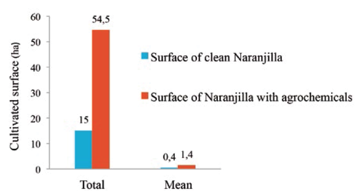 Emphasizing the ways of Naranjilla crop management, from the hectares dedicated to Naranjilla crop, 1.4 ha on average, they are cultivated in a conventional manner, which is, with the use of agrochemicals; while only 0.4 ha are cultivated in a clean manner, using organic fertilizers made by the same producers (Figure 4).