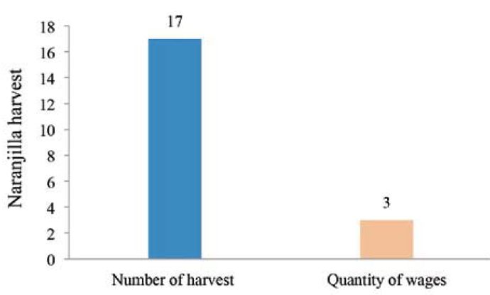 In relation to Naranjilla harvest, is carried out manually from the eight months of sowing. This labor is carried out on average 17 times a year, and they use three wages per harvest (Figure 5). These results demonstrate the potentialities of the species, resulting in an alternative to improve the family economy.