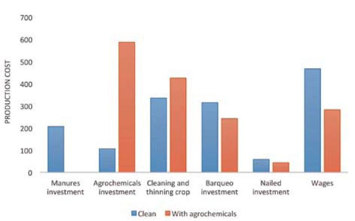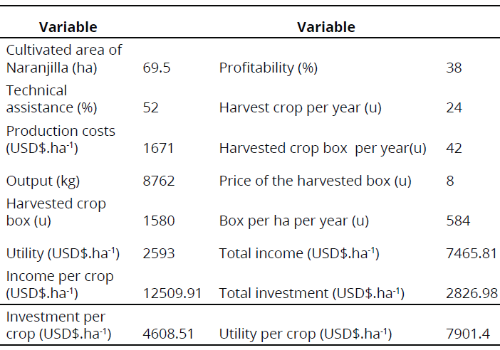 It is notorious that the production costs (ha.year-1) in relation to analyzed outputs, were higher for the conventional Naranjilla crop (Figure 6).