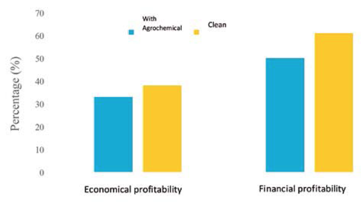In Figure 7, the levels of economic and financial profitability of the Naranjilla clean crop and with agrochemicals are represented, verifying that the clean management way is more profitable, which is a reflection of the value and cost production behavior of the Naranjilla crop. Subsequently, the profitability percentages were low.