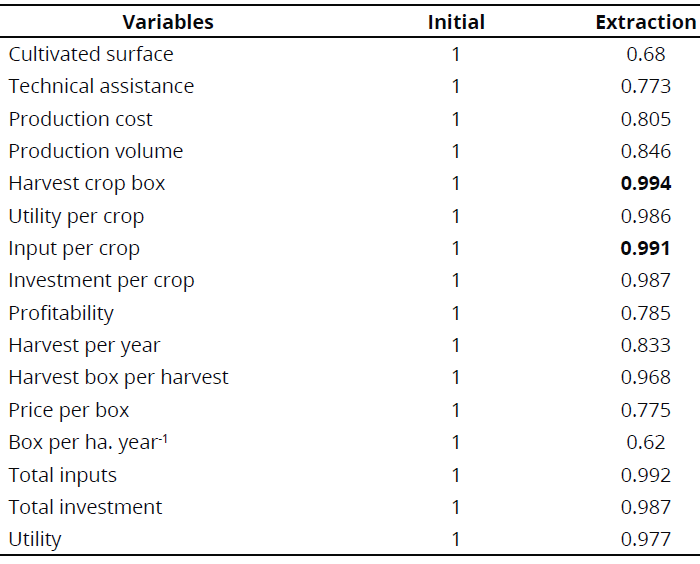 Therefore, a factorial analysis was performed as a multivariate technique, which have allowed to identify the underlying factors or the dimensions that reflect what the variables share in common, from which, it was found that the original variables obtained from the study, were correlated among each other. The variables included in the study were as follows: Naranjilla surface, technical assistance, production cost, production volume, crop boxes, utility, income and investment per crop, profitability, harvests per year, boxes per year, price per box, box.ha-1. year-1, total income, total investment and profit in one year, respectively (Table 1).