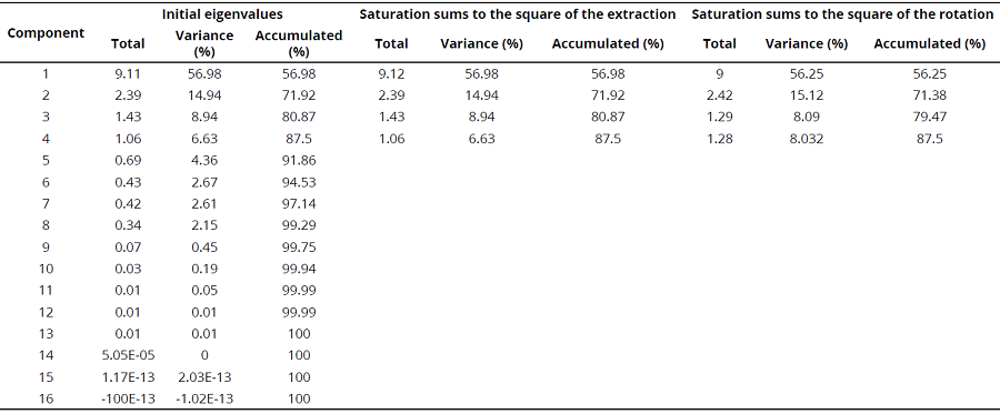 The factorial analysis showed that the variables share common factors. The "commonality" of each variable is what explains the factors and what determines that there is a relationship between each pair of variables that form the set of the original variables. Table 2, shows the analysis of communalities as estimates of the shared or common variance among variables.