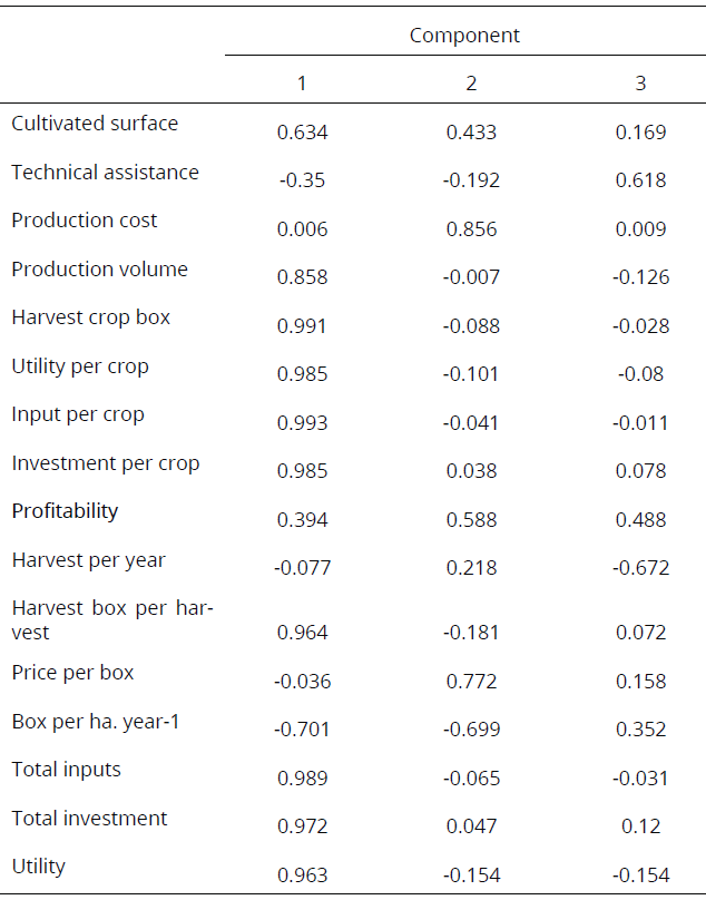 Table 4, shows the matrix of principal components vs. the selection of three components. The first group includes variables related to productive activity (area, production volume, harvest crop boxes, utility, input and investment for crops, input per crop, income per ha.year-1, total input, total investment and profitability), The second component is associated with the economic factor (production cost, profitability and market price) and third with the social factor (technical assistance and harvests per year). The factors were selected to explain the interrelationships among variables and reduce them. It is noteworthy that the first component grouped those variables of productive activity directly related to the Naranjilla crop production and other crops that are produced in the study area as follows: forest crops, plantain, cassava and pastures, respectively. Faced with the current scenario of other crops that are produced in the study area, Naranjilla, shows greater relevance to the economy of the Wamani community producers. In the second component, the relationship of the variables is evident due to profitability is determined through production cost and in the third, there are the variables that most relate with the social conditions of the inhabitants, evidencing that the 52% has received technical assistance for crop management and this is reflected in the harvests per year.