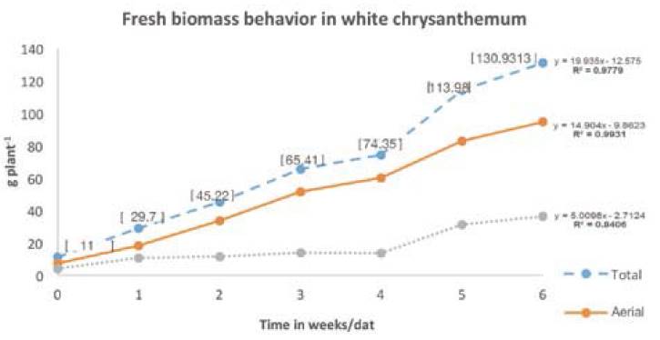 From Figure 1, is possible to infer white chrysanthemum performed a steady growth pattern until week 4, therefore, its development is accelerated and during weeks 4 and 5, the aboveground biomass had achieved an increasing which ranged from 51% to 55.7% plant root biomass, this increasing in root biomass lasted two weeks close to 52%. This indicates that under the production-system protocol used in this study, could increase two stages of plant growth and development as follows: 1 up to week 4, and 2 up to weeks 4 and 6.