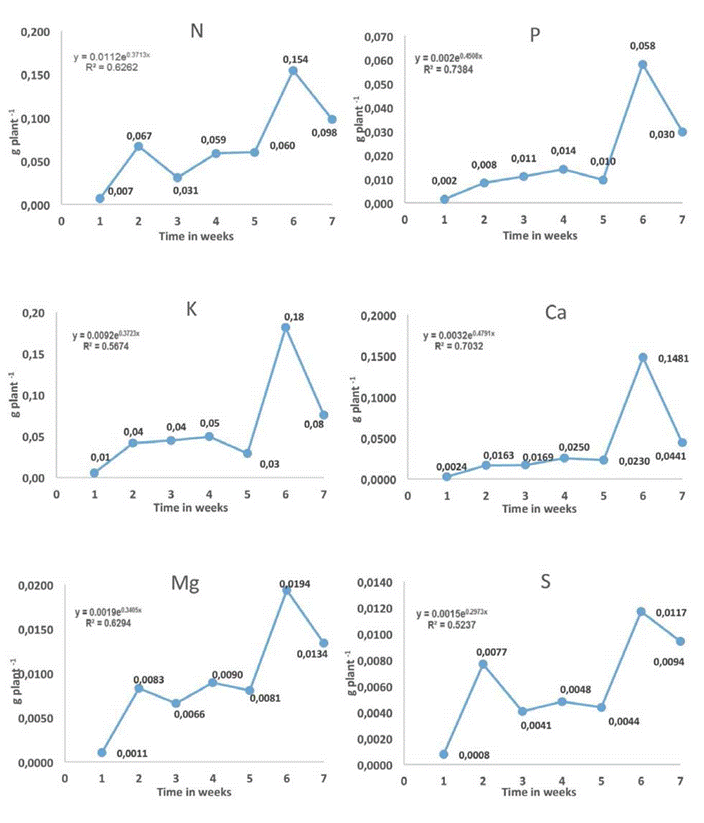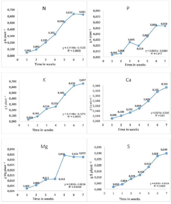 In addition, a trend was evident in absorption timing, among weeks 9 and 10, which was the period of maximum absorption of K, Mg and Ca. In the case of N, P and S, plant absorption performed an increasing tendency during the evaluation time, which indicates that if not reap a week 12, could continue to accumulate these elements. Additionally, it was observed an absorption tendency to retain the same behavior as air extraction and plant root biomass, separately.