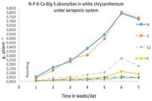 This study evaluated the absorption-extraction curves in white chrysanthemum, bearing this in mind, the present work is intended to conclude that under the evaluated conditions in aeroponic system, maximum levels of total nutrients Ca (84.5%), K (83.33%), P (82%), S (62, 4%), N (61%), and Mg (58%), were absorbed from week 5 after transplantation, which provides more accurate and reliable estimates of nutrient extraction in White chrysanthemum from air and root biomass, which performed a similar behavior. Given these concerns, plant fertilization can be oriented in two applications as follows: one at transplantation timing and the other, at the end of week 4.