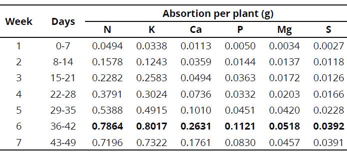 These data indicates the major elements (N-P-K), were extracted from the aboveground part of plant in greatest quantity during the period among 28 and 42 dat, which corresponds to weeks 4 and 5, respectively. Ca, Mg and S, secondary elements show a similar behavior, characterized by an increasing absorption, which ranged from 35 and 42 dat (week 5). Mg